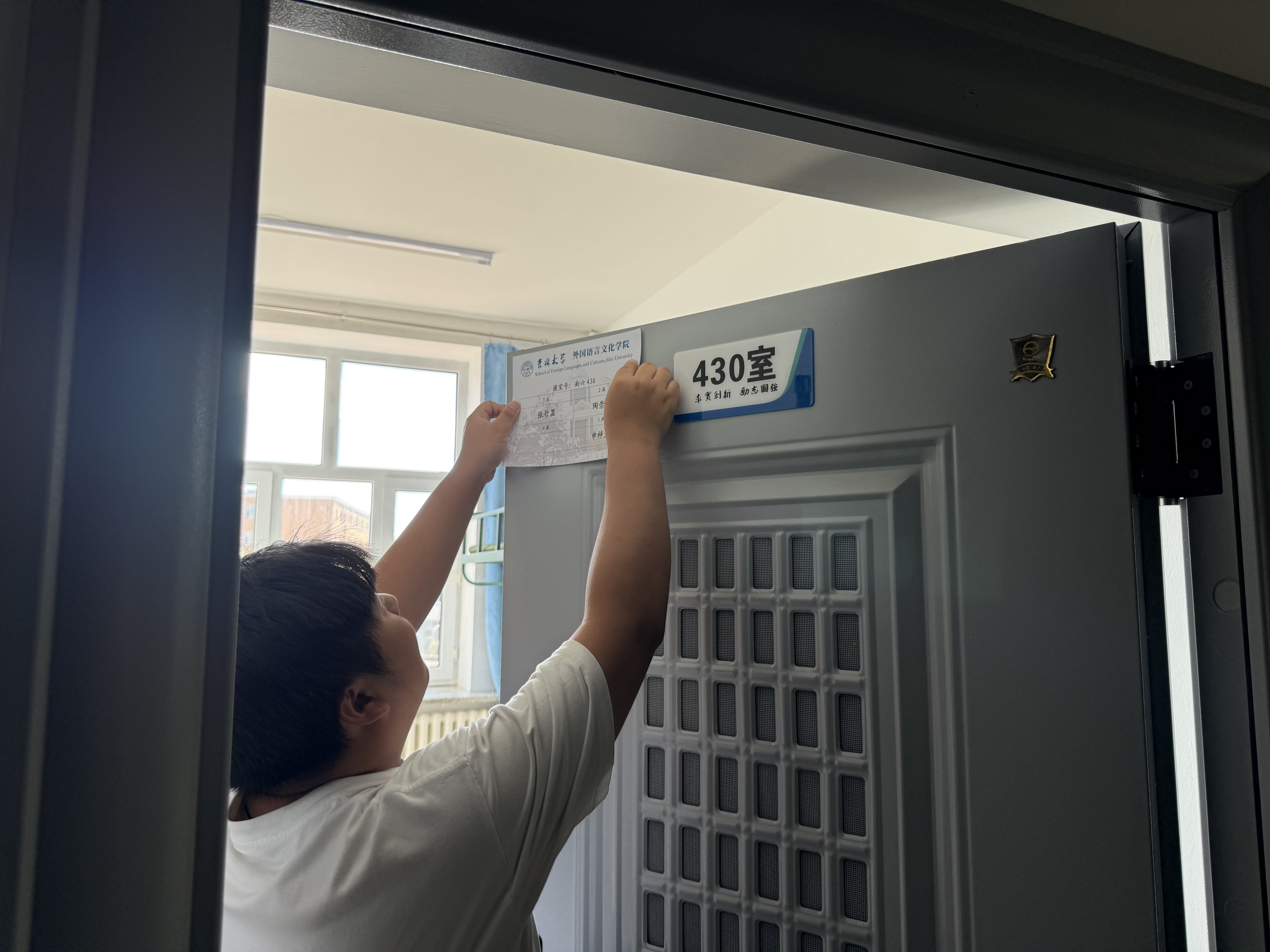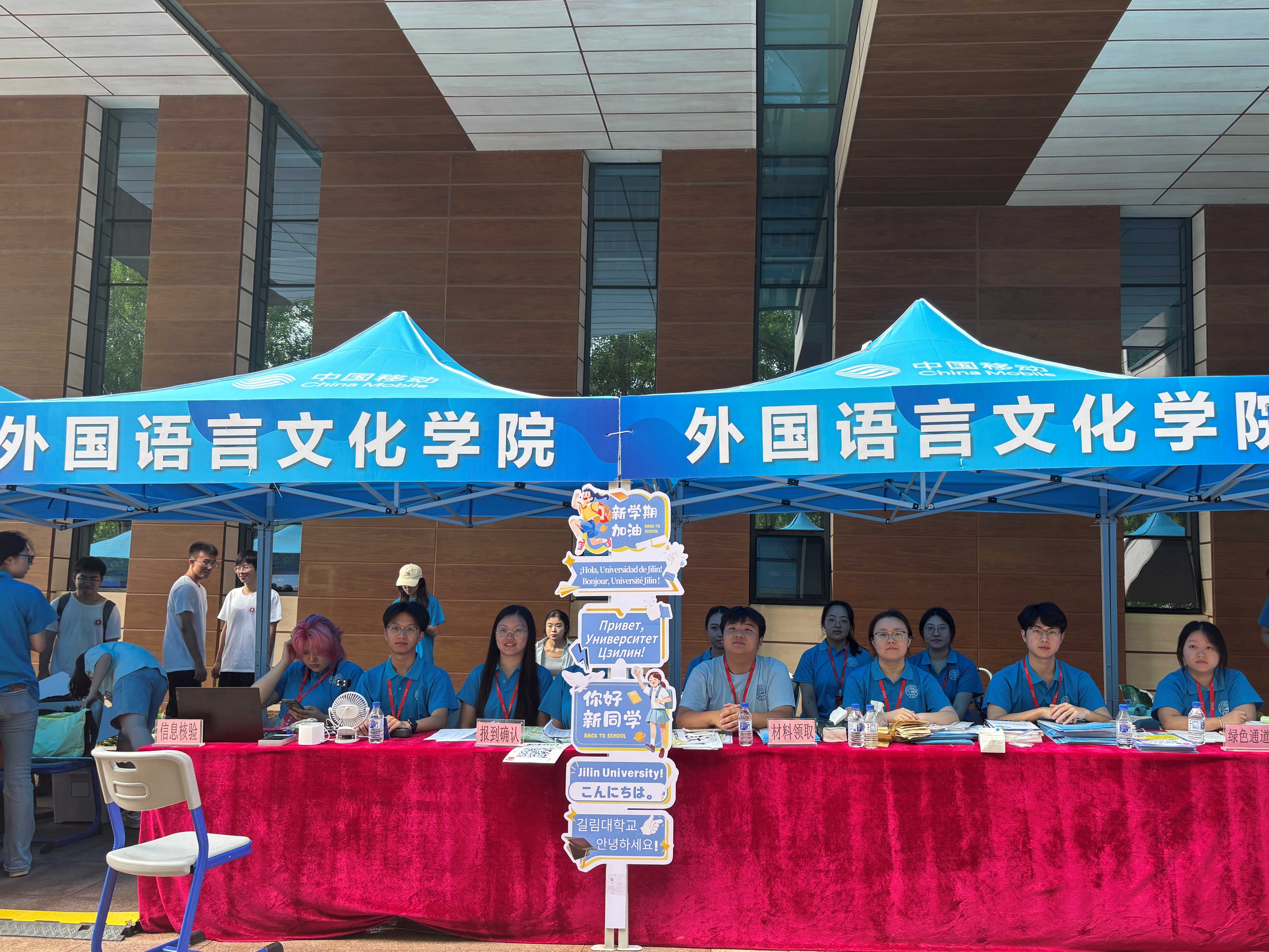 吉林大学外国语言文化学院于8月22日在中心校区宋治平体育馆东侧学院迎新点位进行迎新工作筹备。学生工作办公室楚恒叶、2025级新生辅导员吴昊参与各项准备工作。