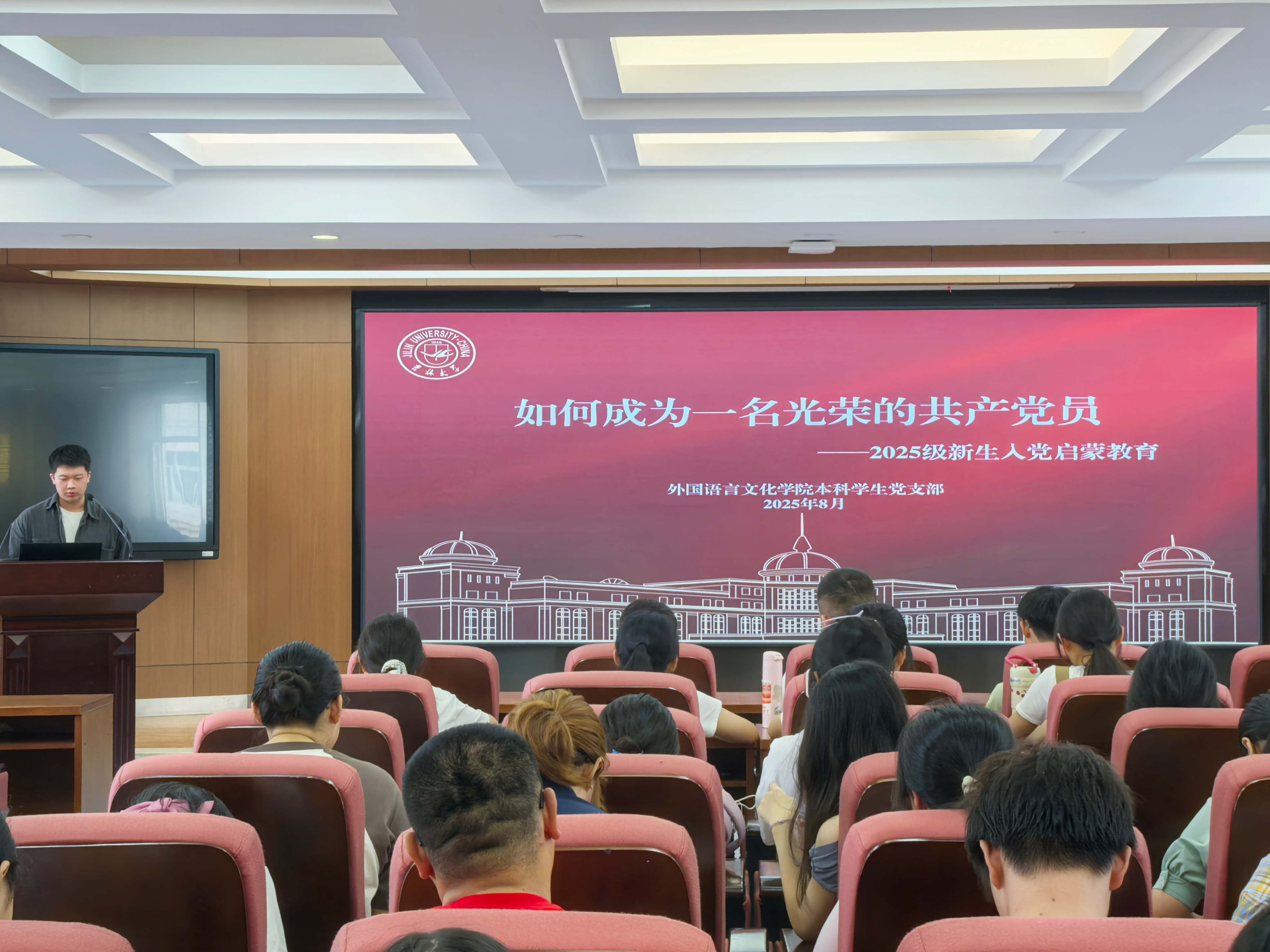 8月25日上午,外国语言文化学院2025级新生入党启蒙教育在外语楼500会议室顺利开展。本次教育活动由2025级新生辅导员吴昊主讲,全体2025级新生参与。