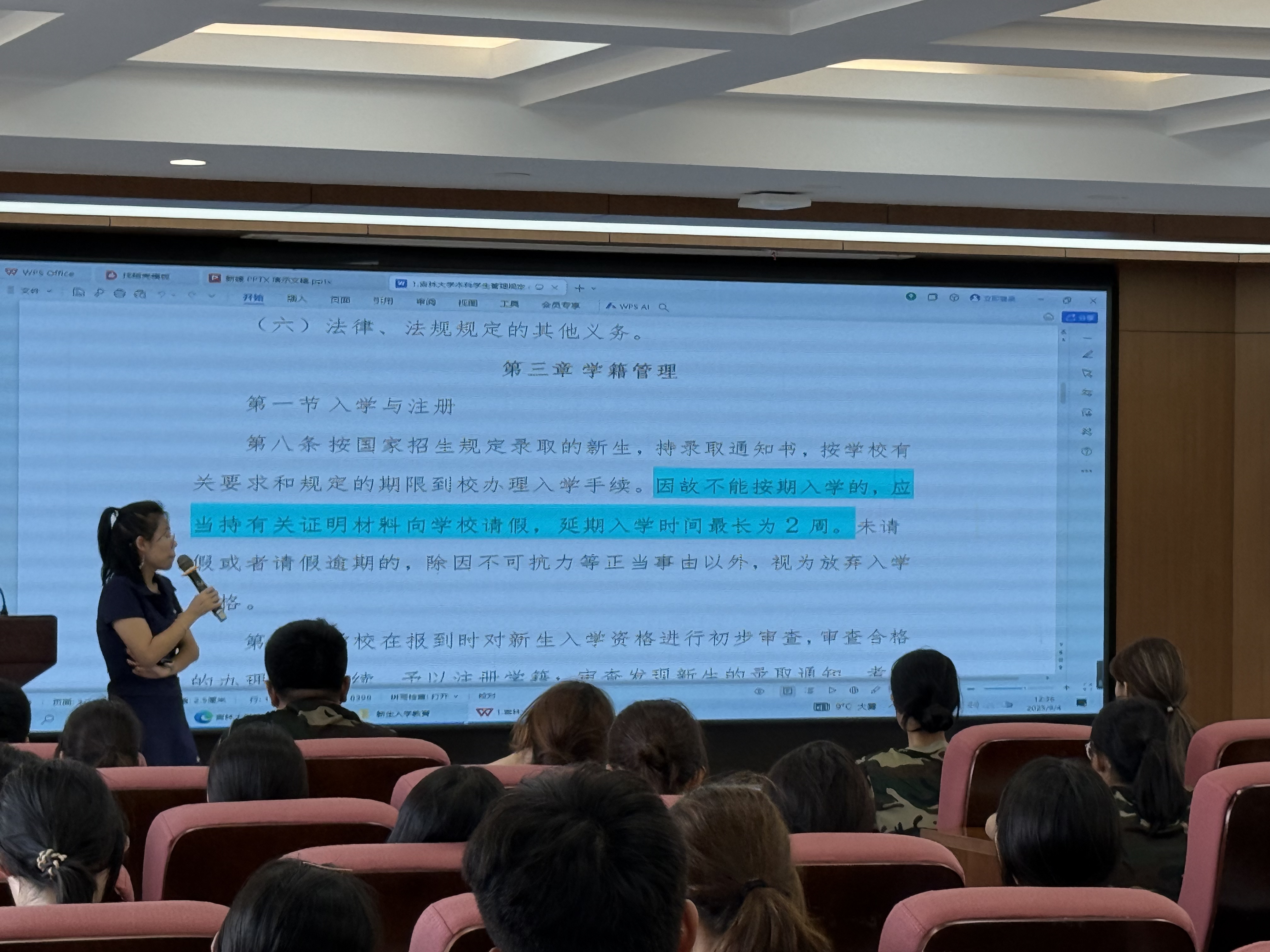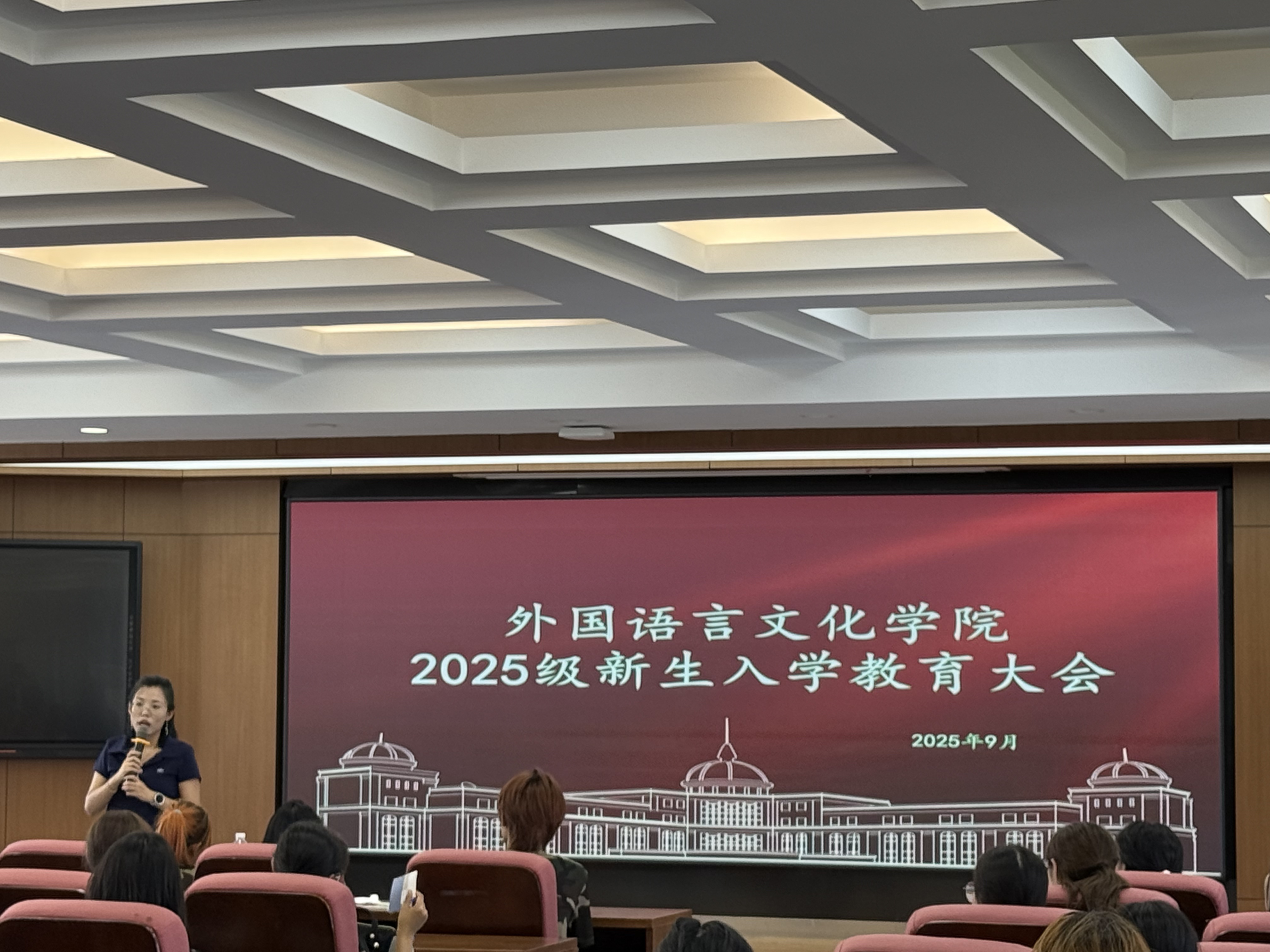 为帮助2025级新生快速熟悉大学教学管理体系,9月4日,外国语言文化学院在外语楼500会议室举办新生教学管理专题会议,邀请学院教学办公室李欣霜老师、周书夷老师为新生讲解学籍、学生管理规定、选课和培养方案等方面知识。