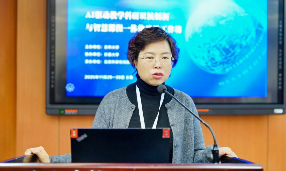 致辞结束后金晶副院长再次对莅临现场的各位领导、专家及参训教师表示热烈欢迎金晶副院长指出,在教育数字化转型的关键时期,AI技术已成为推动教学科研创新、提升教育质量的核心驱动力了,本次工作坊的举办,正是为了回应高校教师在 AI应用中的现实需求,搭建一个跨院校、跨学科的学习交流平台。她希望参训教师能够珍惜此次研修机会,主动交流、积极实践,将所学知识转化为教学科研的实际能力,真正实现“以 AI 赋能、促教学提质”的目标。