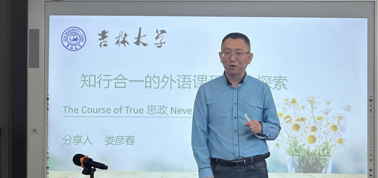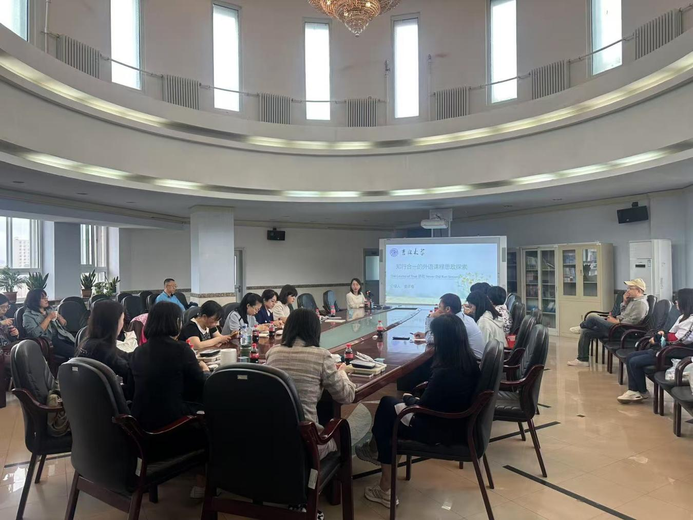 为深入贯彻落实教育部《高等学校课程思政建设指导纲要》,推动外语课程思政教学改革创新,促进教师间经验交流,外国语言文化学院于6月10日举办 “知行合一的外语课程思政探索” 教学午餐会。本次活动在学院六楼会议大厅举行,活动特邀学院大学外语第八教研室的娄彦春老师作为主讲人,学院教师齐聚一堂,共同探讨外语课程思政教学的创新路径与实践经验,活动由金晶副院长主持。