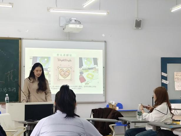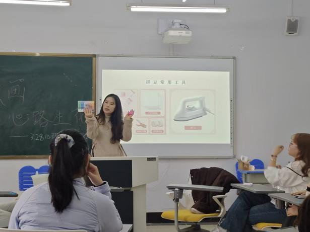活动伊始,心理部部长徐扬介绍活动主题、目的与流程,通过趣味互动让同学们快速融入活动氛围。随后主持人分享拼豆文化与心理疗愈相关内容,讲解拼豆的起源、种类、工具等知识,同时解读其心理价值 —— 高度专注的创作过程能缓解空心焦虑、带来充实感,也能传递真诚,满足情感联结的需求。