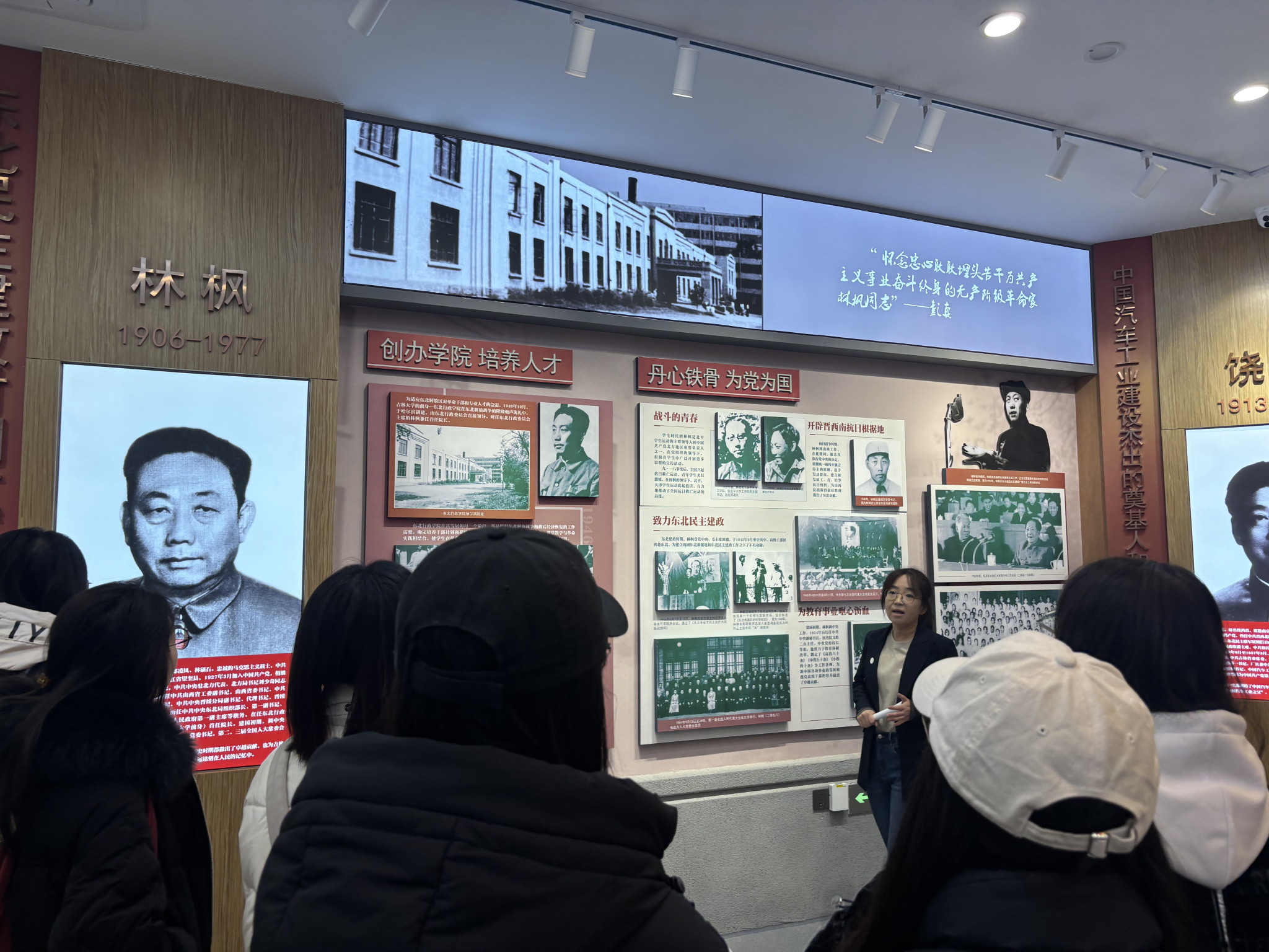 步入“创校先驱”展区,林枫、饶斌、江一真、李四光、陈先舟、任抟九等六校首任校长的雕像肃穆矗立。讲解员详细讲述了在学校初创的艰难时期,先辈们在极端困难的条件下,以赤诚之心和坚韧意志,筚路蓝缕、艰苦创业,为吉林大学的诞生与成长奠定了坚实基础。