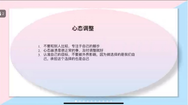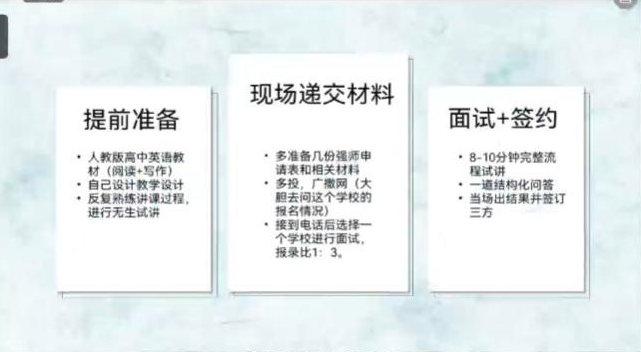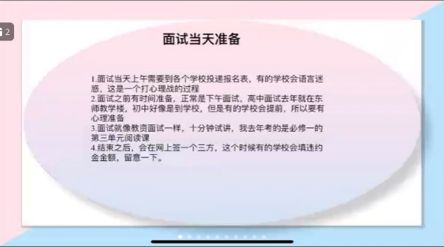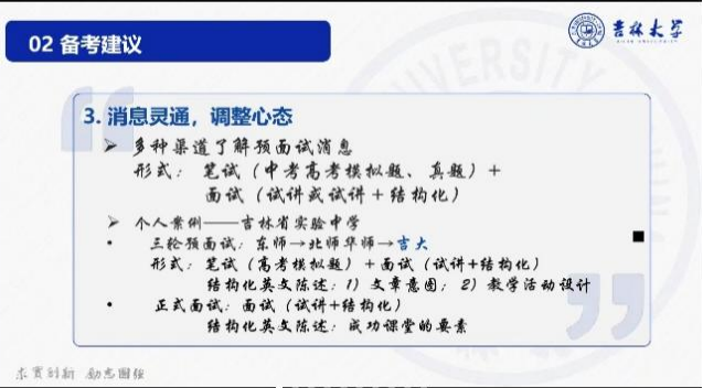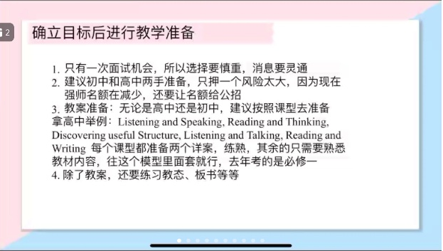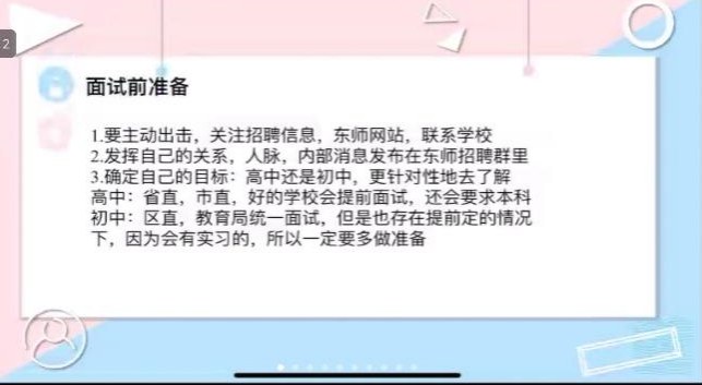 王瑞晗主要从面试前准备、面试当天准备以及心态调整这三个方面分享了自己求职期间的心路历程,从招聘信息获取、目标确定、面试机会选择、教学准备、面试流程及内容等多角度进行了详细的介绍,并在心态调整板块鼓励大家专注自己的目标,积极调整。