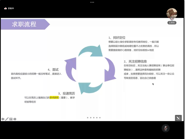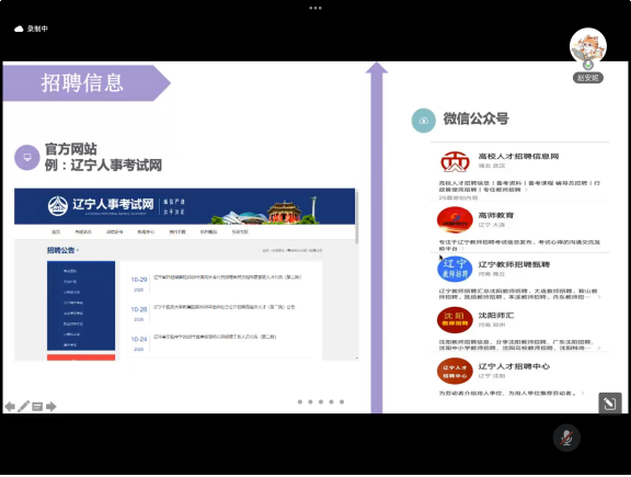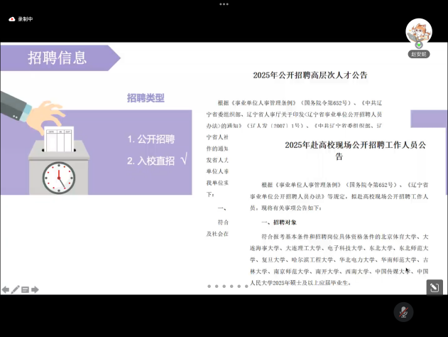 赵安妮结合自身经验与招聘实际流程,围绕 “高校教师岗位招聘与求职全流程” 主题,从招聘信息、求职面试流程到工作内容,详细介绍从信息获取到成功入职的全过程。她强调渴望就业的同学要把握好入校直招的机会,找准定位,关注招聘信息,鼓励大家一次上岸。