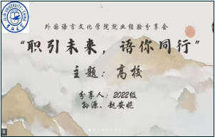 为帮助学生把握就业形势、拓宽职业路径,外国语言文化学院于2025年11月4日晚在线上举办了“职引未来,语你同行”系列就业分享会第二期。本期主题聚焦“高校教师职业发展路径”,学院2022级毕业生孙源、赵安妮主讲,分享求职与备考经验。会议由中心研究生会发展指导部部长赵倩主持,研究生辅导员林明帅和各年级研究生同学线上参与。