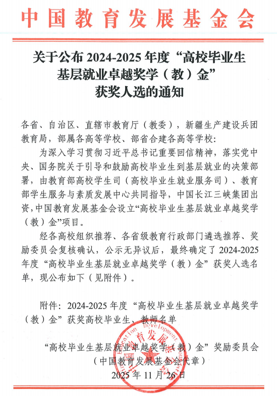 近日,由全国“高校毕业生基层就业卓越奖学(教)金”由教育部高校学生司(高校毕业生就业服务司)、教育部学生服务与素质发展中心共同指导,中国长江三峡集团出资、中国教育发展基金会特设的2024—2025年“高校毕业生基层就业卓越奖学(教)金”获奖名单公布,该奖项是对高校毕业生扎根基层、建功立业的权威表彰,吉林大学外国语言文化学院2021届毕业生王乃卉位列其中。