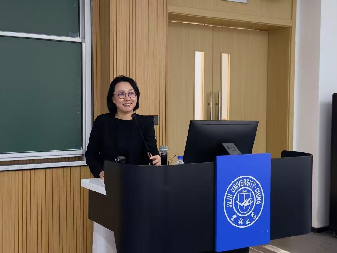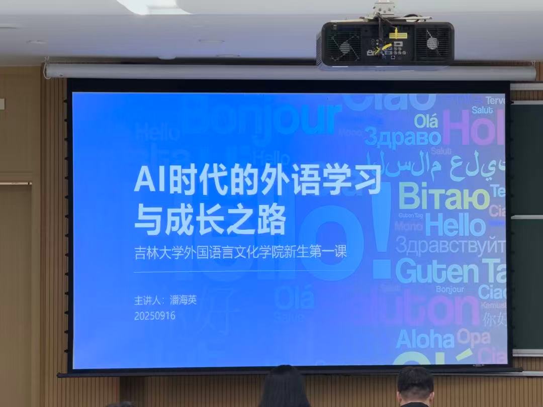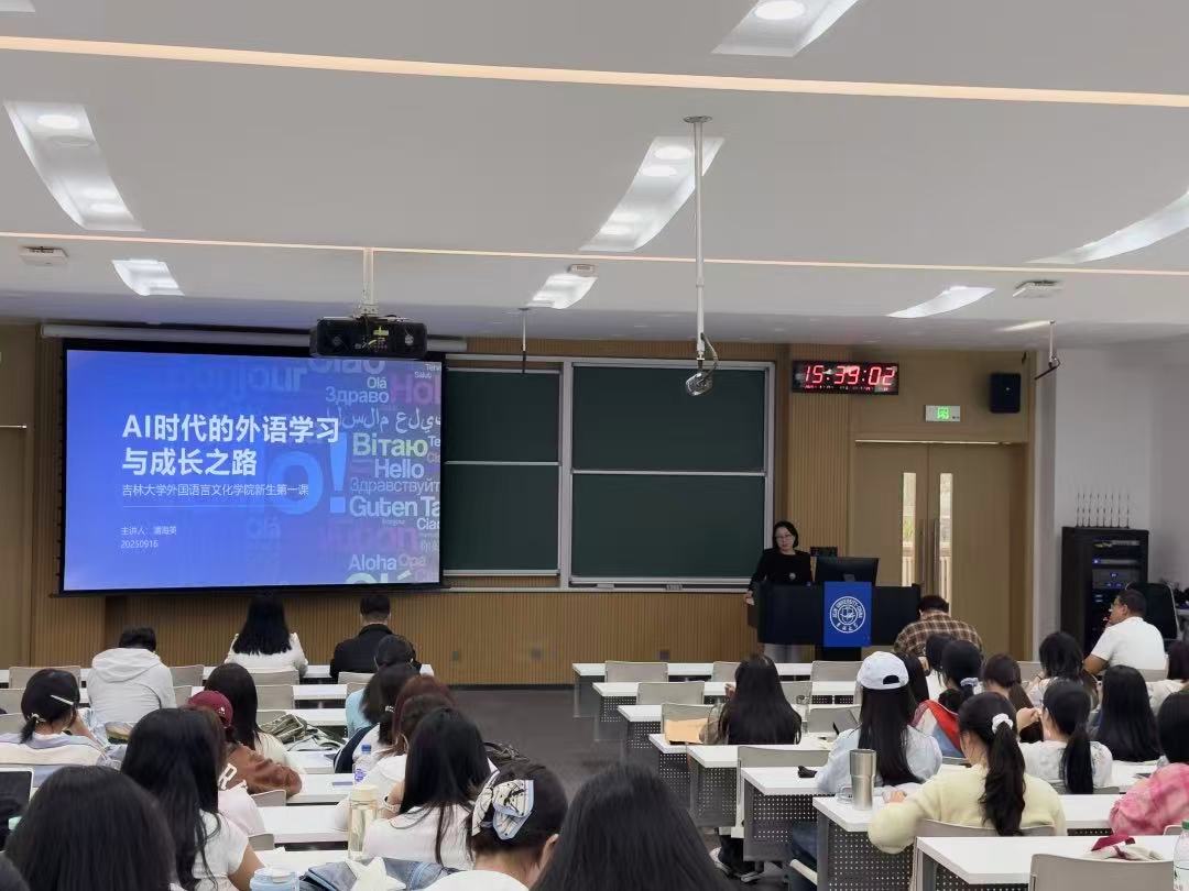 讲座开始前,潘海英院长与全体新生共同庆祝吉林大学外语学科成立75周年,增强了同学们的专业自信与归属感。潘院长告诉大家,2025年是外文学院在大数据时代转型的关键年,学院在国际合作网络和师生出访实践等方面进行了一些新的尝试。她寄语新生“学会管理时间,不被任务追赶”,同时强调“外语不应局限于文字,而要成为融合文化的工具”。